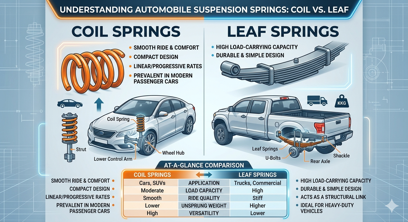 Intellectus quae sunt duo genera automobile suspensa fontes Primus gradus est aestimanda machinalis implicata quae vehicula stabilia et tuta servat. Utrum sit versatilis et commodus ver coil aut praerupta et certa folium vere ambae technologiae criticam exercere in infrastructura globali onerariis pergunt. Ut materiae et vehiculum pondera evolvenda, haec duo genera fundamentalia verisimile permanebunt fundamentum autocineti suspensio per multos annos futuros.